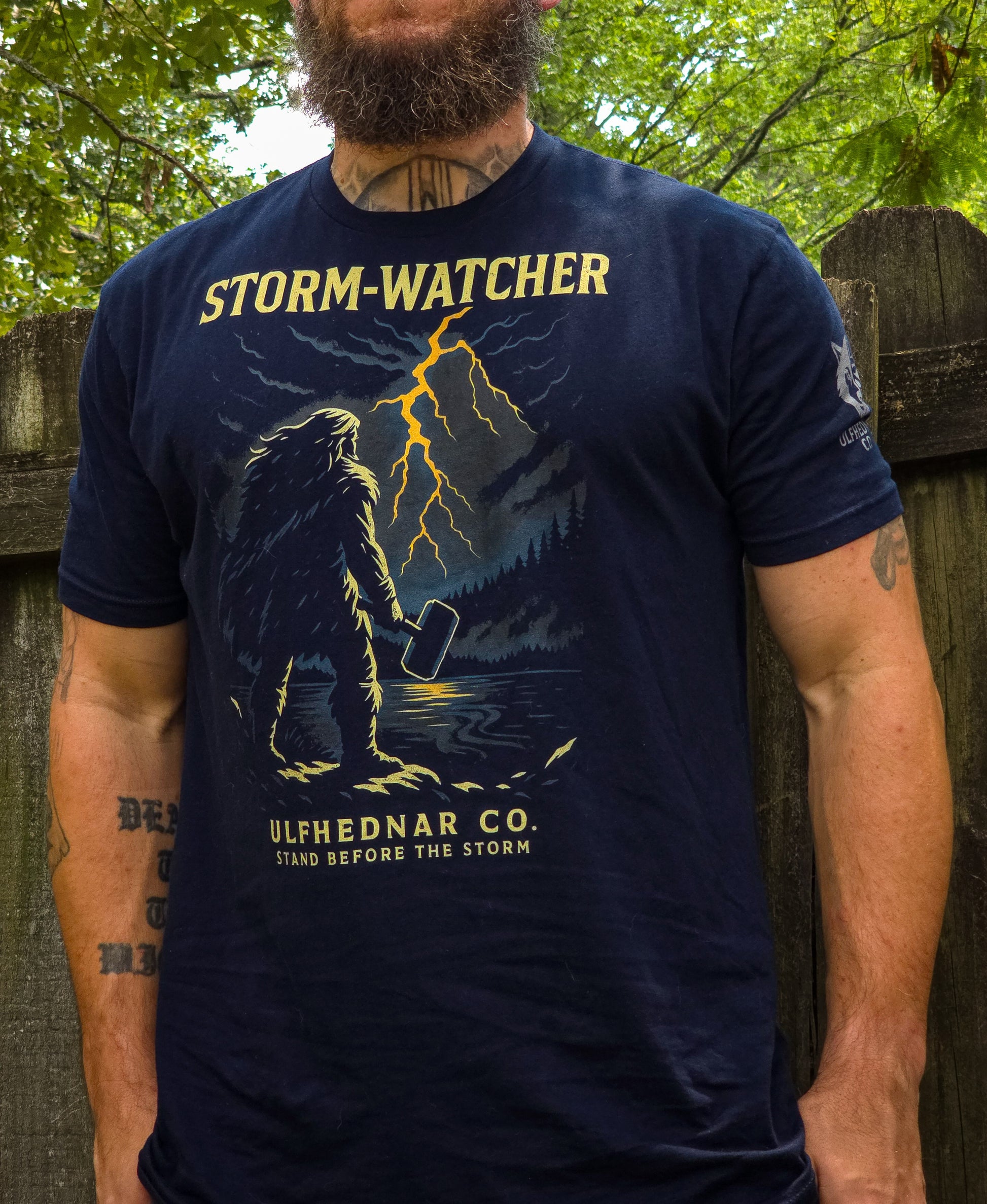 Some fear the lightning—others walk toward it. The Storm-Watcher stands on the edge of the tempest, Mjölnir in hand, ready to meet the fury of the gods head-on. This tee is a call to those who face the storm, not with hesitation, but with purpose.